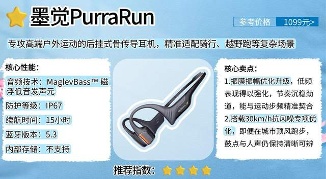 总结:墨觉PurraRun精准适配骑行、越野等复杂运动场景。产品耐用性与运动适配性尤为亮眼,尤其适配注重抗风噪效果、佩戴稳固性与信息清晰传递的进阶运动爱好者。