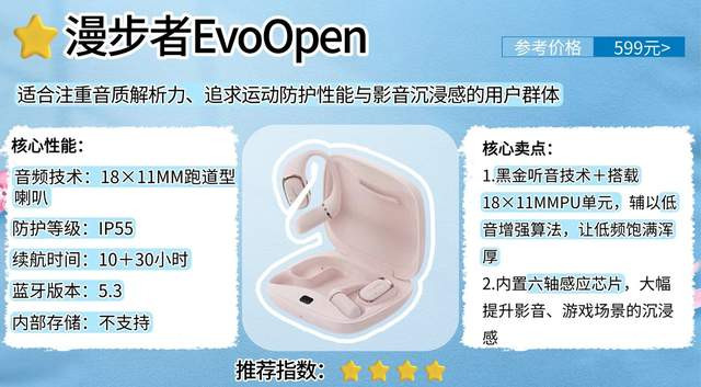 总结:漫步者EvoOpen整体表现契合其中端产品定位。尤其适合注重音质解析力、追求运动防护性能与影音沉浸感的用户群体。