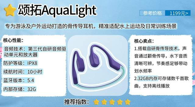 总结:颂拓AquaLight凭借顶级防水性能、大容量存储与稳固佩戴体验,构成核心竞争力,完美适配水上运动需求。核心性能扎实可靠,尤其适合重视水下听音体验、追求运动实用性的游泳及户外爱好者。