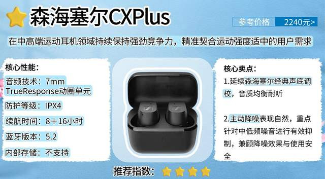 总结:森海塞尔CXPlus以均衡耐听的音质、自然的降噪效果与舒适无压的佩戴体验为核心优势,续航与防水性能稳定可靠。产品整体表现扎实出众,是注重听感品质、运动强度适中用户的优质之选。