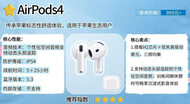AirPods4传承苹果标志性舒适体验,凭借轻量化设计、旗舰级音质与苹果生态优势完成运动场景适配升级,成为兼顾日常与健身的优质音频伴侣。