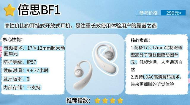 倍思BF1是一款主打高性价比的耳挂式开放式耳机,亲民定价实现音质与实用性的平衡,成为注重长效使用体验用户的靠谱之选。