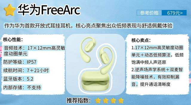 总结:华为FreeArc依托真实技术配置,表现扎实可靠。整体适配中低强度运动与日常场景,尤其适合注重音质体验、无需适配高强度运动的华为生态用户。
